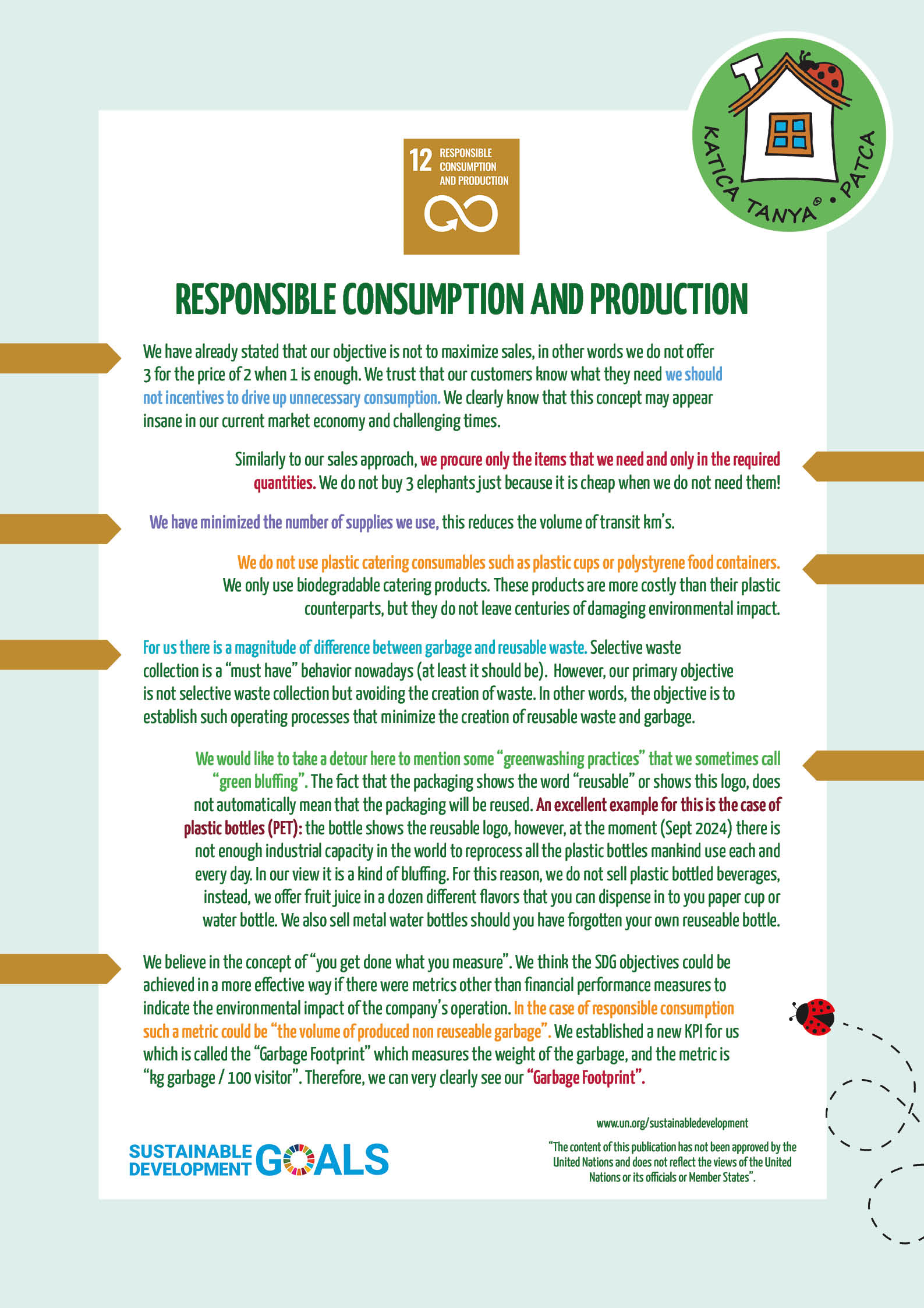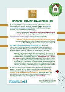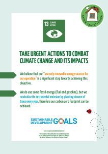 The non-biodegradable, one time use catering packaging such as plastic cups and straws plus packaging such as styrofoam food containers creates huge volumes of non-reusable garbage. We only use biodegradable products such as paper cups and food containers for our catering services. Therefore our ecofootprint is zero in this perspective. It is slightly more expensive but we think this is an important and relatively small change in behavior!