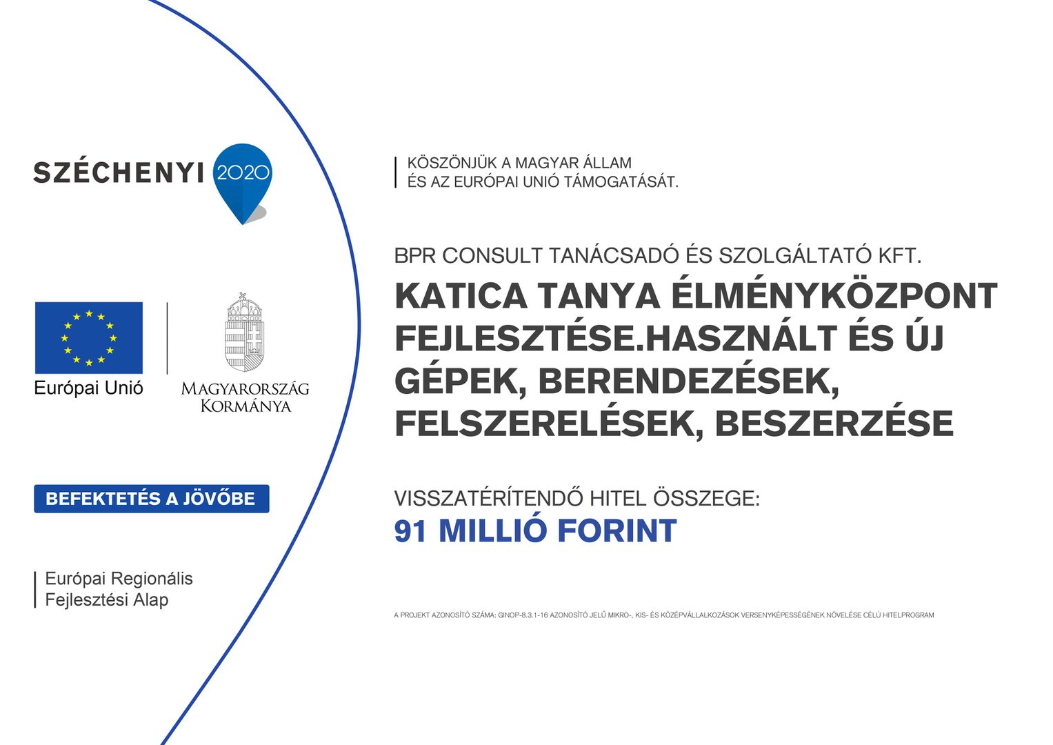 A kedvezményezett neve: BPR Consult Kft. A projekt címe: A BPR Consult Kft. kihívásokhoz való alkalmazkodását segítő fejlesztése A szerződött támogatás összege: 23.499.497,- Ft. A támogatás mértéke (%-ban): 70%. A projekt tartalmának bemutatása: A tervezett komplex fejlesztés kiterjed a konyhai eszközök technológiai fejlesztésére, a Kalandpark átfogó információ technológia fejlesztésére, a meglévő fűtési rendszer korszerűsítésére, a megújuló energiahasznosításon belüli levegő-víz hőszivattyús rendszer telepítésére, valamint forgóeszköz beszerzésre. A projekt befejezési dátuma: 2021.12.31. A projekt azonosító száma: GINOP-1.2.8-20-2020-02098 A támogatás alapja: Európai Regionális Fejlesztési Alap (ERFA), Befektetés a jövőbe.