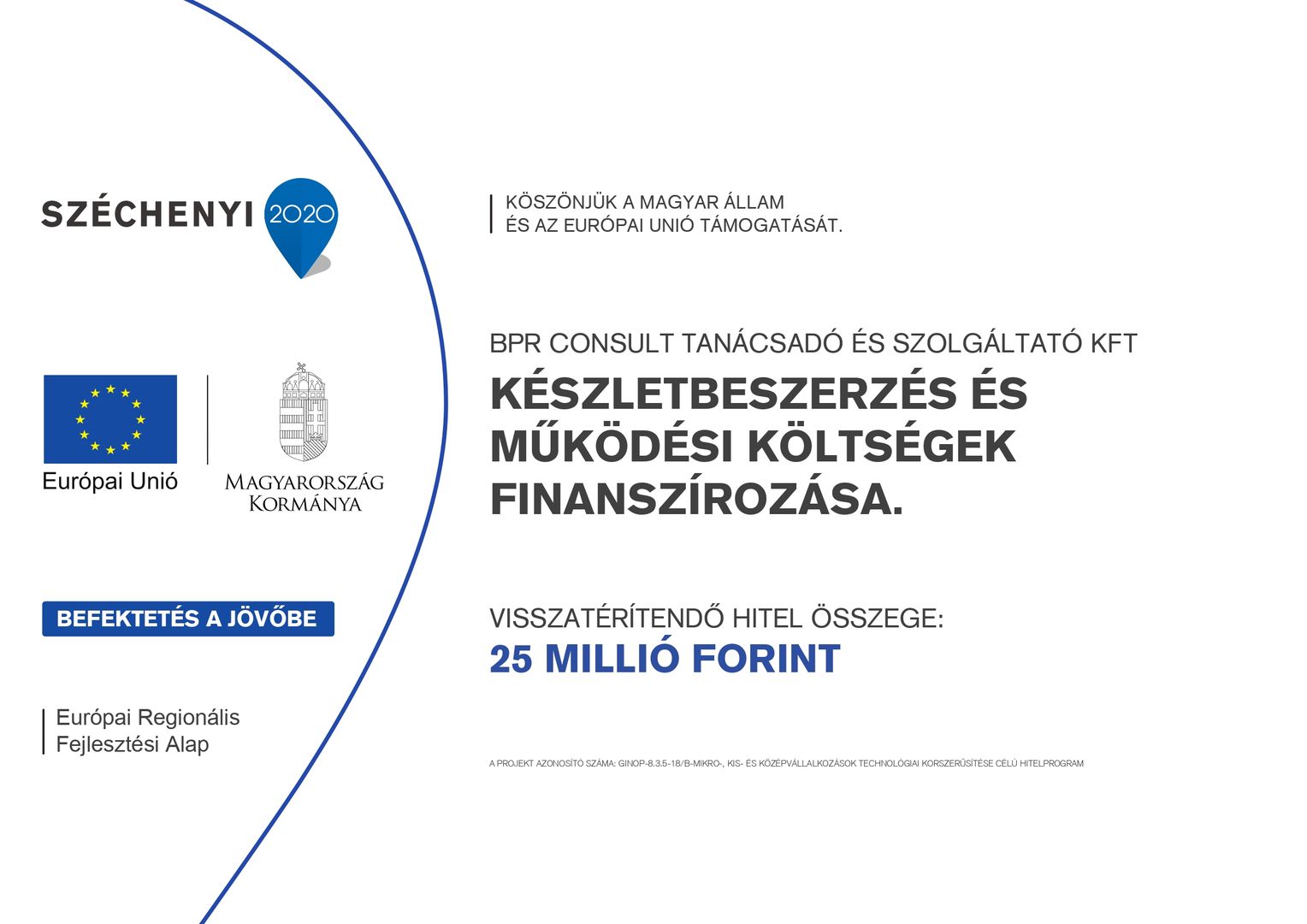 A kedvezményezett neve: BPR Consult Kft. A projekt címe: A BPR Consult Kft. kapacitásfejlesztése A szerződött támogatás összege: 14 547 096 Ft A támogatás mértéke: 30 %